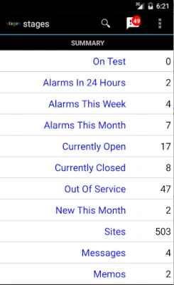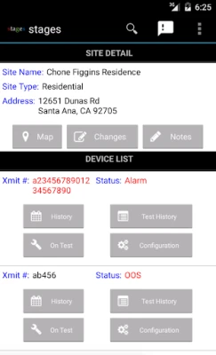 The stages™ Mobile app allows Android owners to very quickly access and manage their account base hosted on a stages™ powered Central Station. Users can check their account base at a glance, manage the entire alarm equipment testing process, and access key account information. Search for accounts, call or email contacts, place accounts on/off test, review recent alarm history and test results, acknowledge notifications, all from this simple to use mobile application.